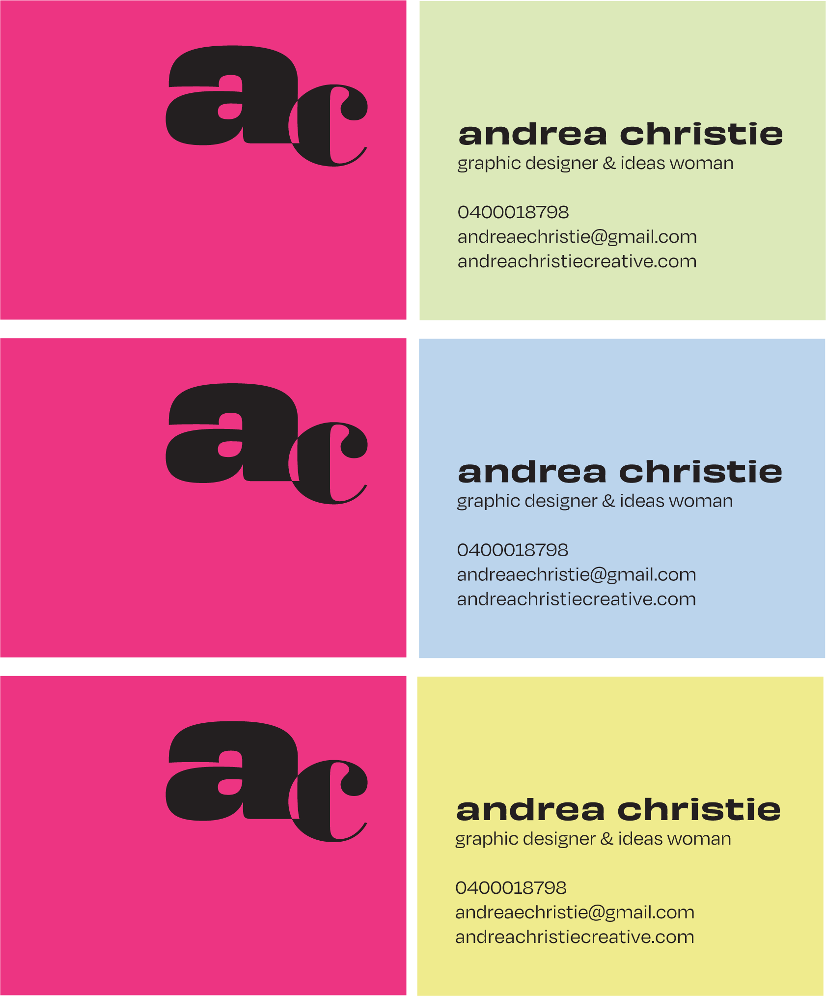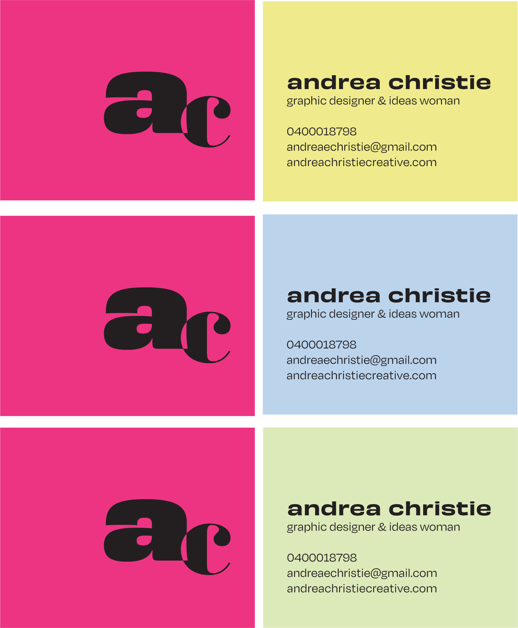 My aim was to create a cohesive personal brand that encapsulates me and my design style. When looking at creating my logo, I knew I wanted to incorporate how I write my lowercase ‘a’s, as not many people write them like I do. I also knew I would use bold colours, but I wanted the logo to be recognisable regardless of the colours I used, knowing I would want to mix it up in the future.