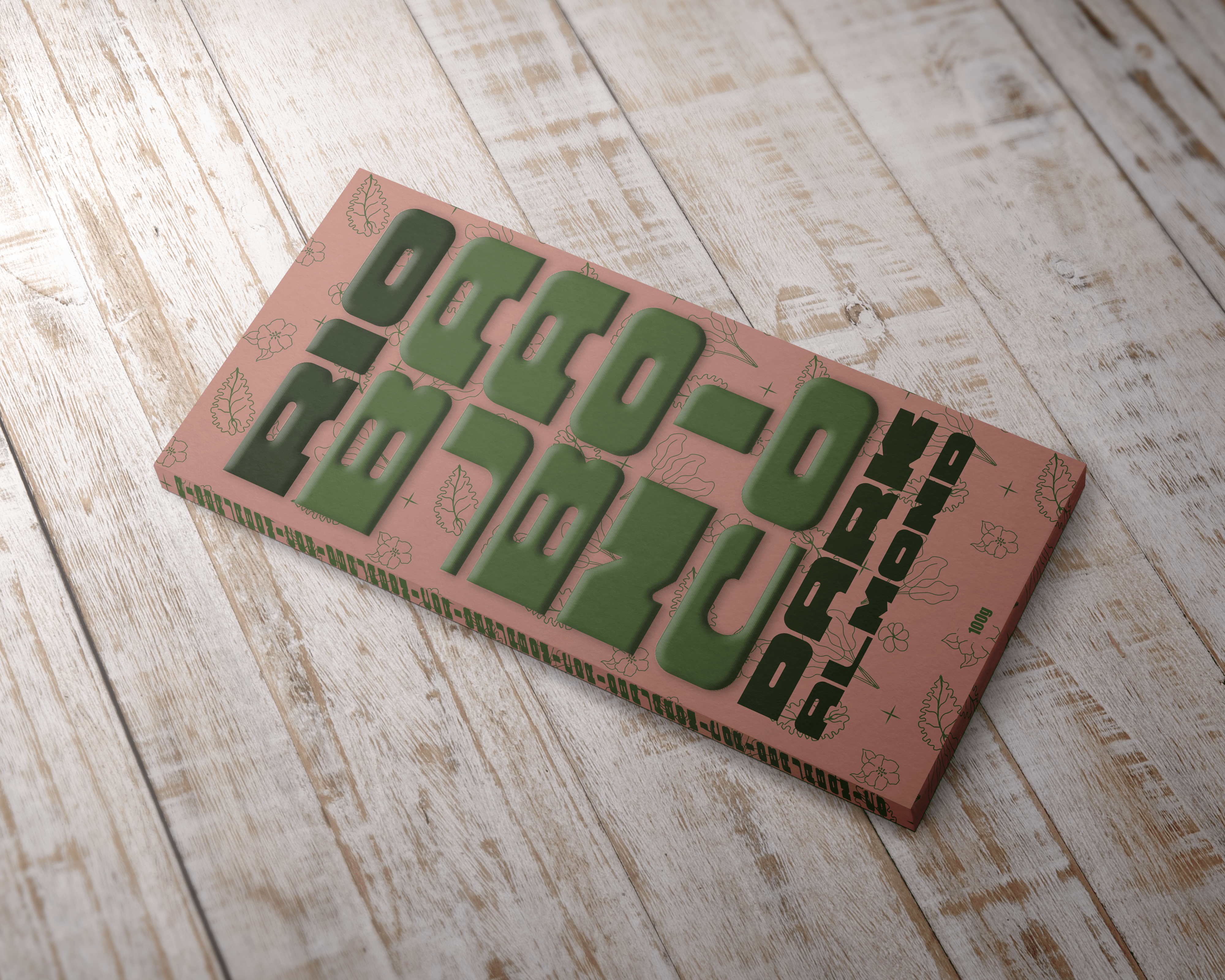 Packaging for a boutique chocolate block, showcasing the Dominican Republic, where the cacao beans were sourced from, and considering sustainability during all stages of production. The substrate specified is compostable, and combined with eco-friendly inks and embossing, this package can be returned to the earth without harming the planet.
